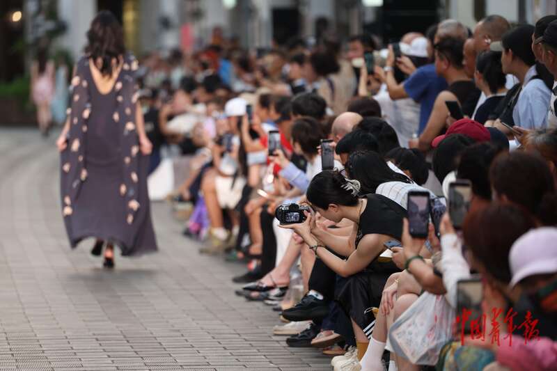 4月13日,海南海口骑楼老街,2026海南青年国际时装周秀场上,观众拍摄模特走秀。中青报•中青网记者 曲俊燕/摄