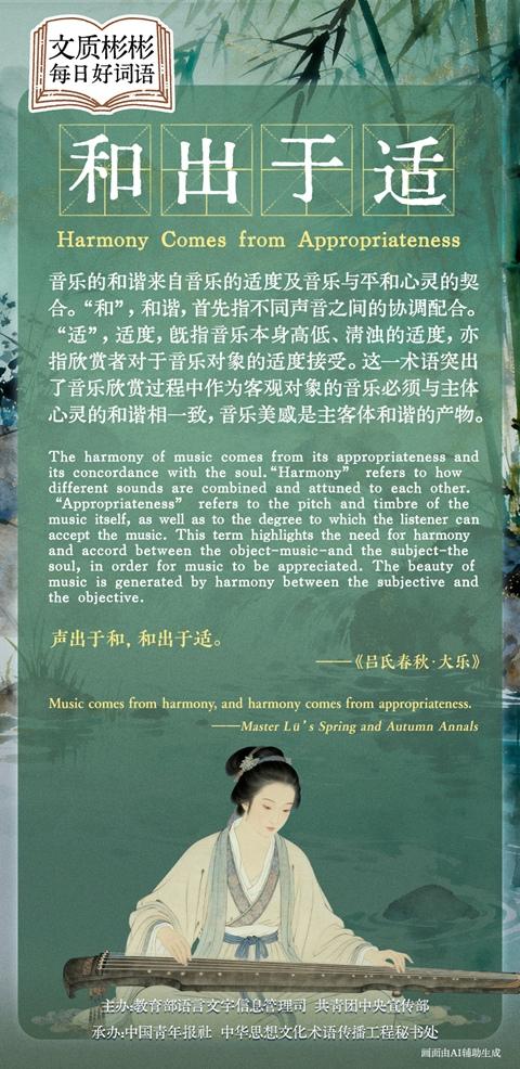 音乐的和谐来自音乐的适度及音乐与平和心灵的契合。“和”,和谐,首先指不同声音之间的协调配合。“适”,适度,既指音乐本身高低、清浊的适度,亦指欣赏者对于音乐对象的适度接受。这一术语突出了音乐欣赏过程中作为客观对象的音乐必须与主体心灵的和谐相一致,音乐美感是主客体和谐的产物。