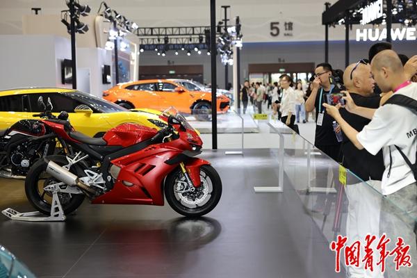4月14日,海南海口,海南国际会展中心,第六届消博会免税与高端精品展区,张雪机车吸引了众多参观者的关注。前不久,在世界超级摩托车锦标赛葡萄牙站,来自中国重庆的张雪机车在中量级组别中包揽两回合冠军,打破了欧洲、日本等厂商对这一赛事长达数十年的垄断。在本届消博会上,各个国家和地区的“新、奇、特、酷”消费精品争相亮相,为参观者带来充满新鲜感的观展体验。中青报·中青网记者 曲俊燕/摄