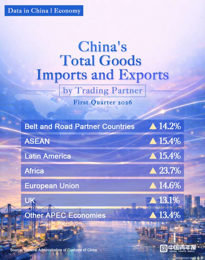 On the export side, China's exports totalled 6.85 trillion yuan in the first quarter, up by 11.9 percent year on year. Exports to the Association of Southeast Asian Nations grew by 17.5 percent, while exports to the European Union and the United Kingdom increased by 18 percent and by 15.3 percent, respectively. In addition, the rapid growth of the global artificial intelligence sector and green, low-carbon industries has driven a notable increase in demand for smart and green products.