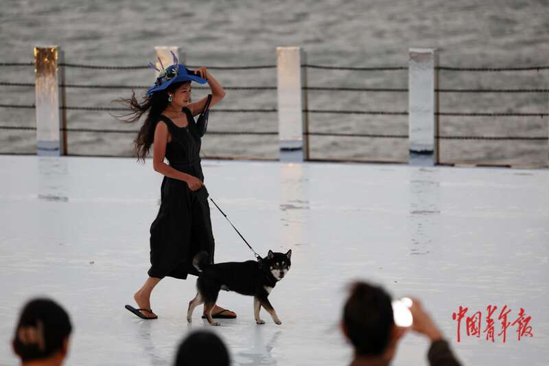 4月17日,海南海口,FUNBAY自在湾,伊裳ISABELLE.C品牌时装秀上,一位模特牵着小狗走秀。中青报·中青网记者 曲俊燕/摄