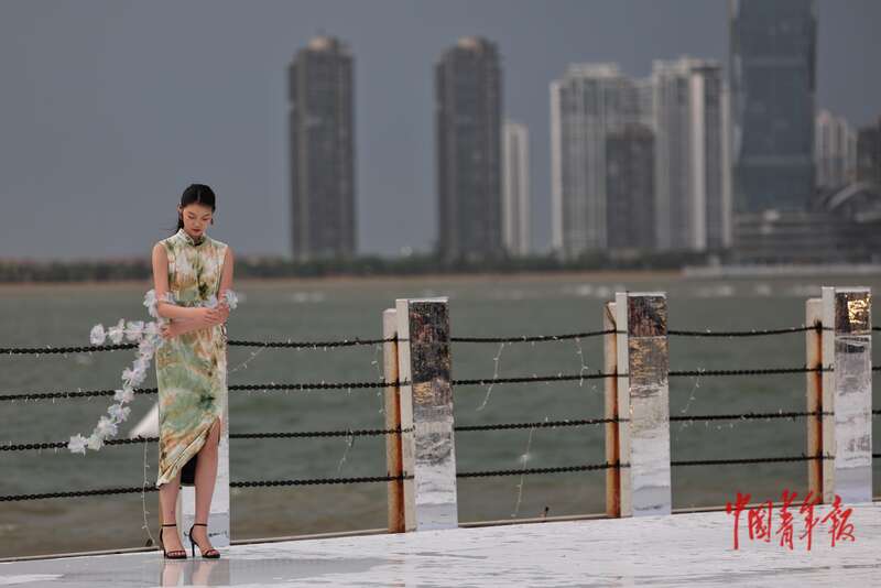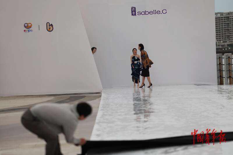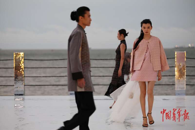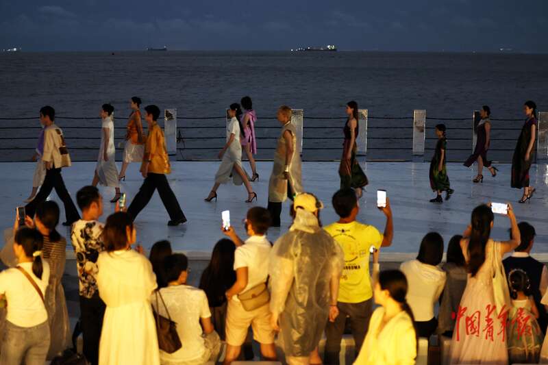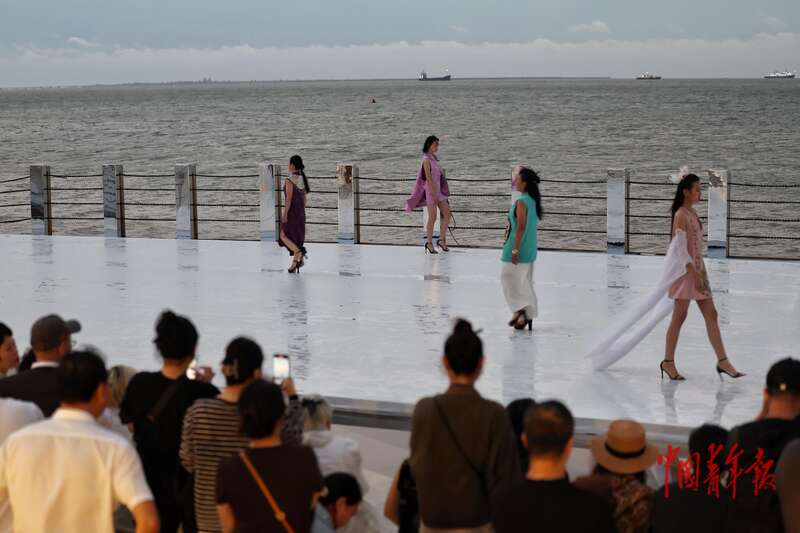 4月17日,海南海口,FUNBAY自在湾,伊裳ISABELLE.C品牌时装秀在海边秀场举行。这场秀是第六届消博会海南青年国际时装周的活动之一,当天走秀开始前下起了大雨,模特们在雨后的秀场为观众献上了一场精彩的时装表演。中青报·中青网记者 曲俊燕/摄