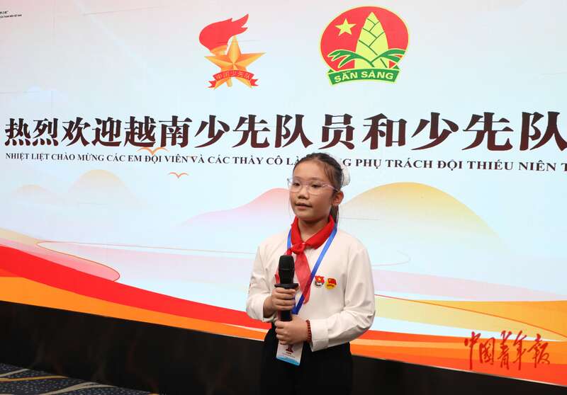 4月16日,北京市八一学校,中越少年“手拉手·心连心·共成长”主题队日活动上,越南的少先队员代表分享感受。中青报·中青网记者 陈剑/摄