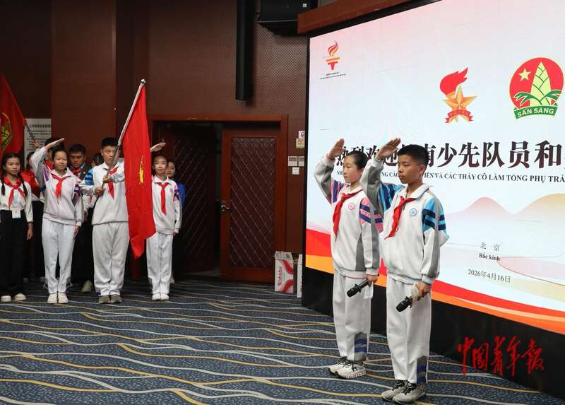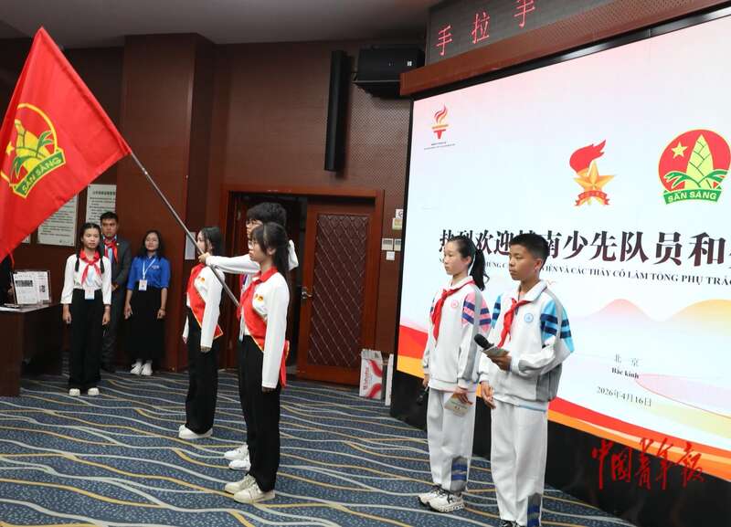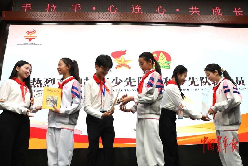 4月16日,北京市八一学校,中越少年“手拉手·心连心·共成长”主题队日活动上,出越南胡志明少年先锋队队旗。中青报·中青网记者 陈剑/摄