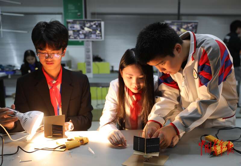 4月16日,北京市八一学校,中越少年“手拉手·心连心·共成长”主题队日活动结束后,两国少先队员代表同上一堂科技课。该校少先队员陈奕帆(右一)和来自越南的少先队员黎芳宝玉(中),一起制作太阳敏感器的科技手工。中青报·中青网记者 陈剑/摄