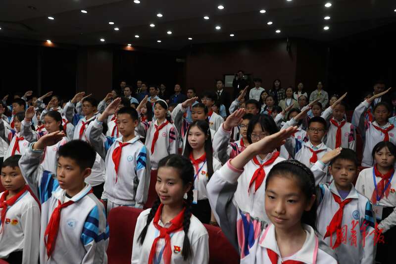 4月16日,北京市八一学校,中越少年“手拉手·心连心·共成长”主题队日活动上,出中国少年先锋队队旗。中青报·中青网记者 陈剑/摄
