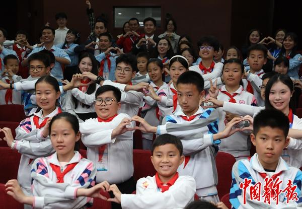 4月16日,北京市八一学校,中越两国少先队员代表一起手拉手“比心”合影留念。中青报·中青网记者 陈剑/摄