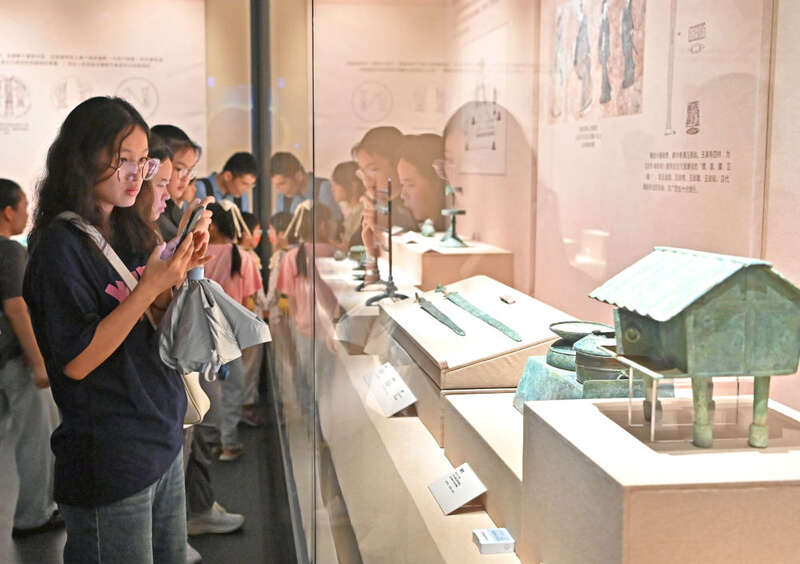 2024年10月1日,“铸于铜 融于心”特展在广西壮族自治区博物馆陈列大楼正式与观众见面。展览分为“从无到有”“多彩共融”“美美与共”三个部分,展出来自广西20多家文博单位珍藏的青铜器文物共计150余件(套)。这是观众在特展现场参观。