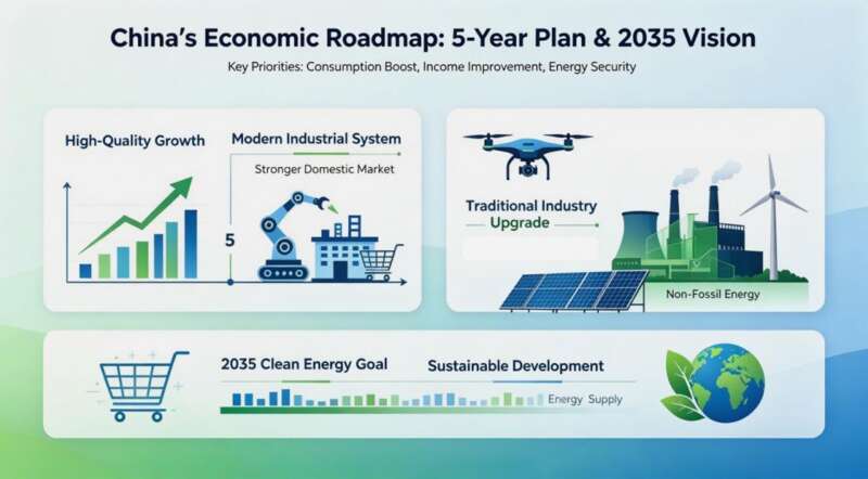 China has outlined its economic roadmap for the next five years, focusing on high-quality growth, a modern industrial system, and a stronger domestic market. Emerging sectors like the low-altitude economy will expand, while traditional industries upgrade through innovation and green tech. Boosting consumption, improving incomes, and ensuring energy security—especially non-fossil energy—are key priorities. By 2035, clean energy supply is expected to double, supporting sustainable development.(Photo/AI)
