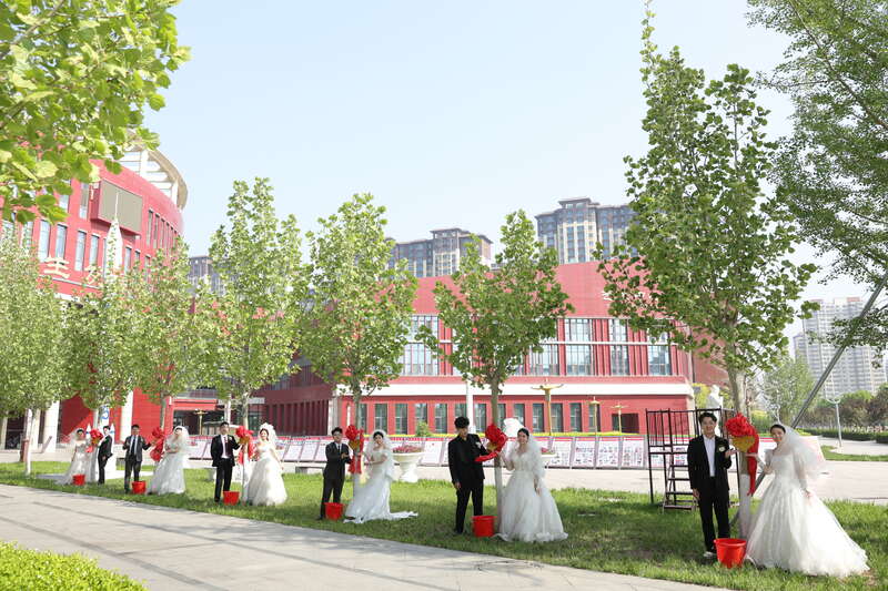 早晨,6对新人首先来到校园绿地认养“同心树”。他们一同培土、浇水,将红色丝带系上枝头。春风轻拂,丝带与绿叶摇曳,新人与树木合影,寓意婚姻与生命共同成长。随后在人工湖畔,新人将金鱼轻轻放入水中,鱼儿游向湖心,涟漪微荡。上午10时,西操场仪式正式开始。6对新人交换戒指、深情相拥,齐声许下“相爱一生,相伴到老”的誓言。