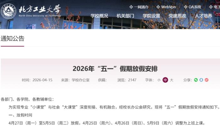 北京联合大学关于2026年清明节放假和春假安排的通知:春假放假时间为4月7日(星期二)至4月12日(星期日)。