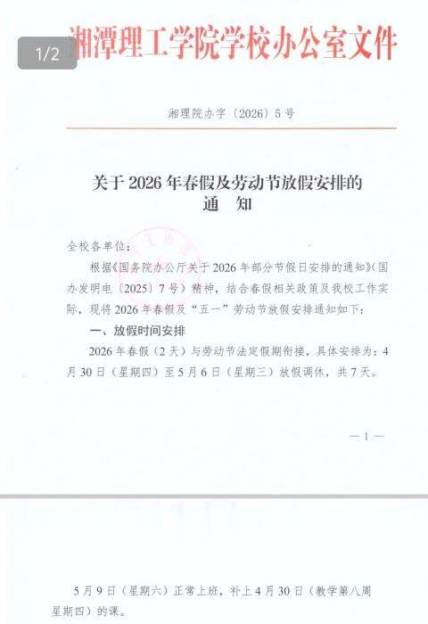 4月17日,湘潭理工学院发布《关于2026年春假及劳动节放假安排的通知》,表示学校将于4月30日至5月6日放春假,与劳动节法定假期衔接,连休7天。