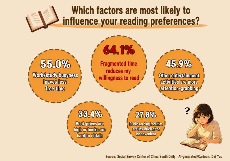 A new survey conducted by China Youth Daily released on World Book Day shows that while reading habits are improving, challenges remain. About 79% of respondents say they can usually finish a book, but many struggle with fragmented time, heavy workloads, and distractions from entertainment.Mobile reading and audiobooks are now dominant, reflecting shifting habits in the digital age. Despite the convenience of online content, many still value deep, focused reading for reflection and personal growth.
