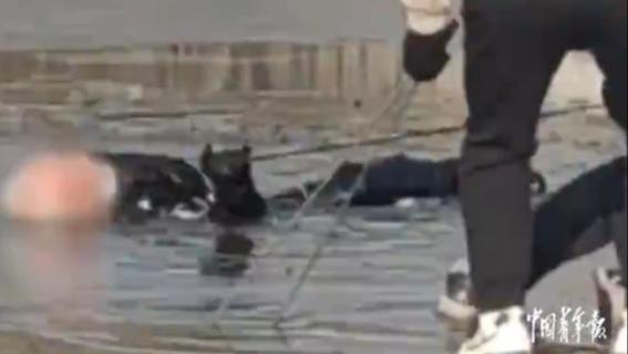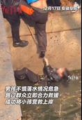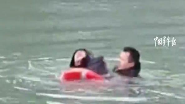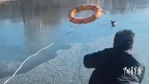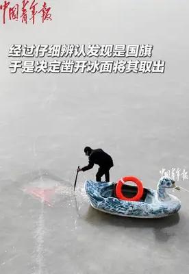 派出所民警巡逻时发现冻结的湖面中有一面国旗,于是决定凿开冰面将其取出