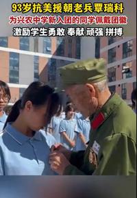93岁抗美援朝老兵覃瑞科为独山县兴农中学新入团的同学佩戴团徽,激励学生勇敢、奉献、顽强、拼搏!