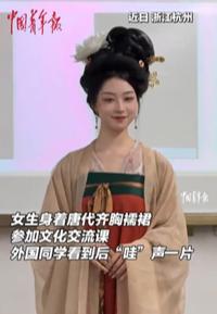 传统文化的吸引力!女生身着唐代齐胸襦裙参加文化交流课,外国同学看到后“哇”声不断。