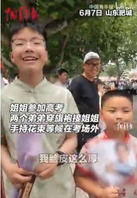 高考考场外,两个“显眼包”弟弟穿旗袍、捧鲜花迎接姐姐,连旗袍颜色也有讲究!