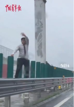 轿车在高速上发生事故横在路中,男子站在护栏上冒雨提醒过往车辆注意安全。#注意安全 #危险行为请勿模仿
