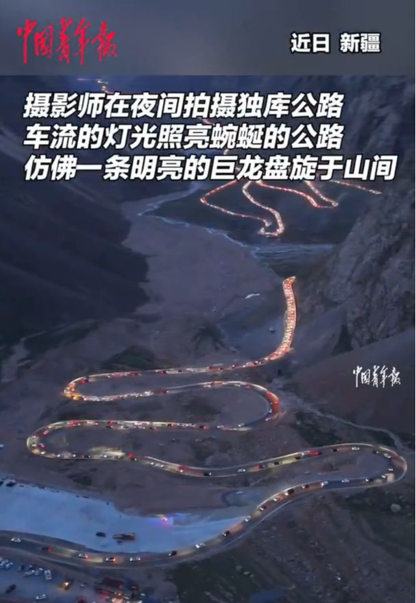 婉若游龙!摄影师在夜间拍摄独库公路,车流的灯光照亮蜿蜒的公路,仿佛一条明亮的巨龙盘旋于山间。@七点七七
