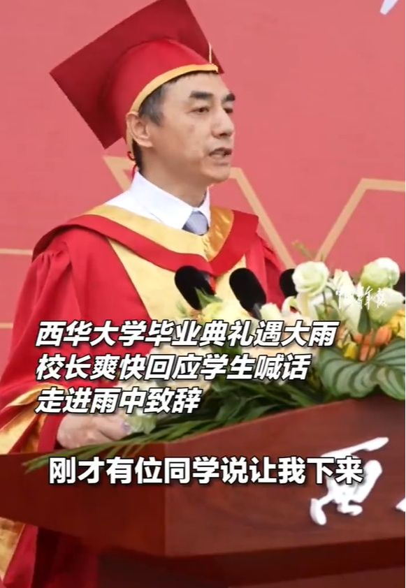 “让我下来,可以!”西华大学校长爽快回应学生喊话,走进雨中进行毕业典礼致辞。@西华大学