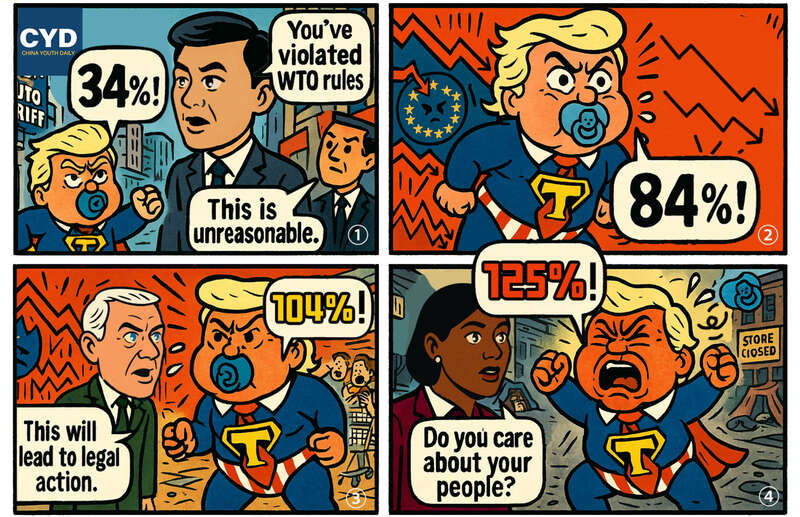The American "Tariff Man" acts like an ignorant infant, disregarding others' words and relentlessly escalating tariffs, ultimately harming American citizens.
