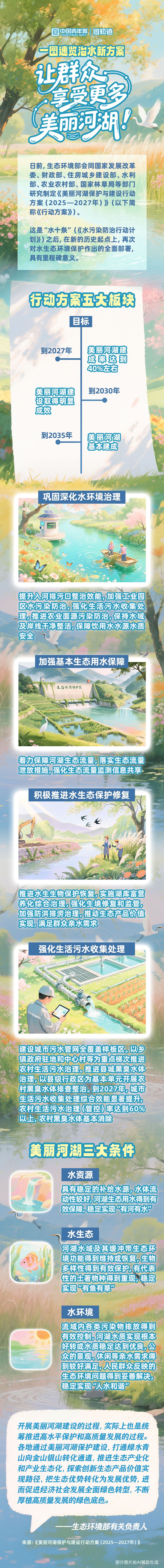 生态环境部会同多部门近日印发《美丽河湖保护与建设行动方案(2025—2027年)》。这是“水十条”(《水污染防治行动计划》)之后,在新的历史起点上,再次对水生态环境保护作出的全面部署。如何让群众享受更多清水绿岸,一图了解。