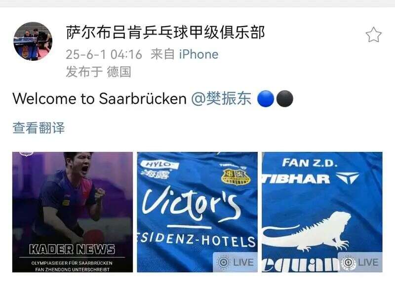 “我对萨尔布吕肯和TTBL的新挑战充满期待,”樊振东表示,“非常渴望成为这支球队的一员,体验全新环境——与团队共同赢得更多胜利。”