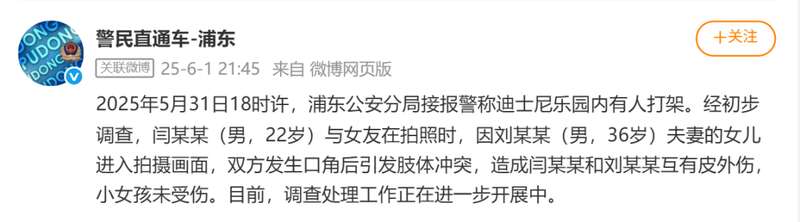 上海市公安局浦东分局官方微博6月1日消息,5月31日18时许,浦东公安分局接报警称迪士尼乐园内有人打架。经初步调查,闫某某(男,22岁)与女友在拍照时,因刘某某(男,36岁)夫妻的女儿进入拍摄画面,双方发生口角后引发肢体冲突,造成闫某某和刘某某互有皮外伤,小女孩未受伤。目前,调查处理工作正在进一步开展中。