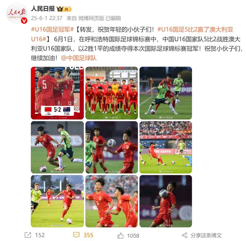 6月1日,在呼和浩特国际足球锦标赛中,中国U16国家队5比2战胜澳大利亚U16国家队,以2胜1平的成绩夺得本次国际足球锦标赛冠军!祝贺小伙子们,继续加油!