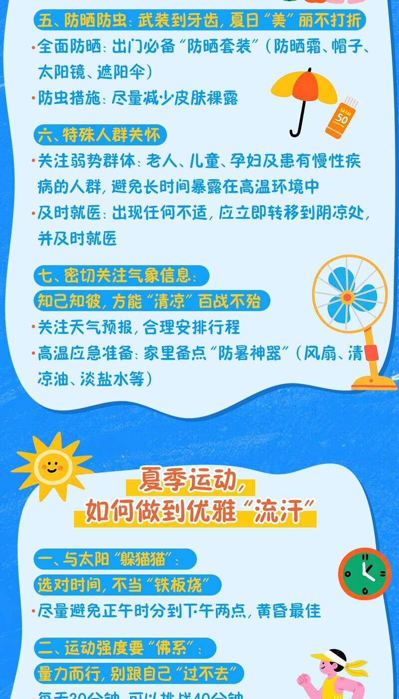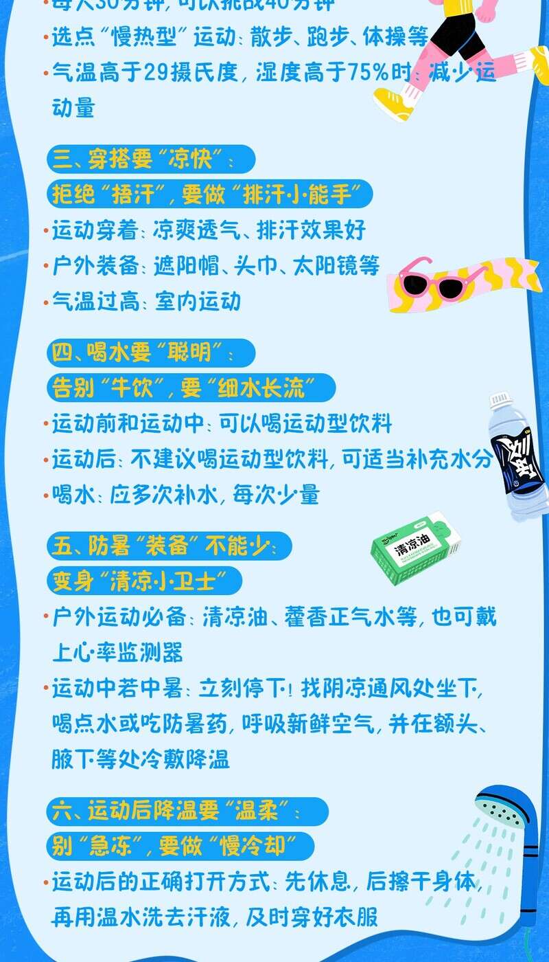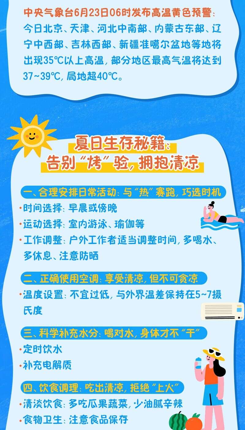 今日6时,中央气象台发布高温黄色预警,全国多地将现35℃以上高温,局地超40℃,“炙烤”模式上线。别慌!一起读图“解锁”人们如何在高温天气下做好防暑降温、科学运动的全攻略。