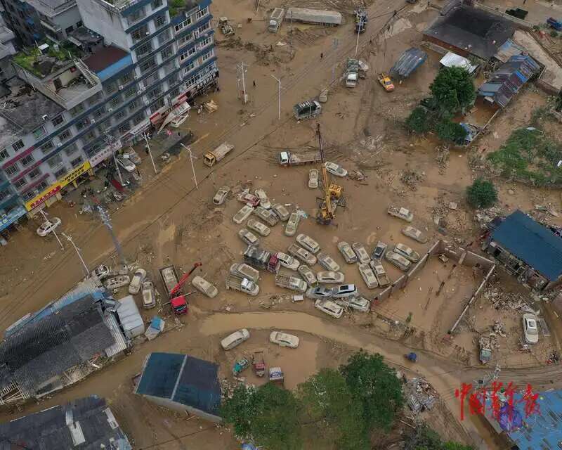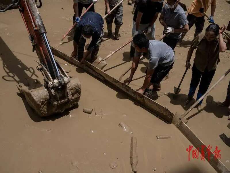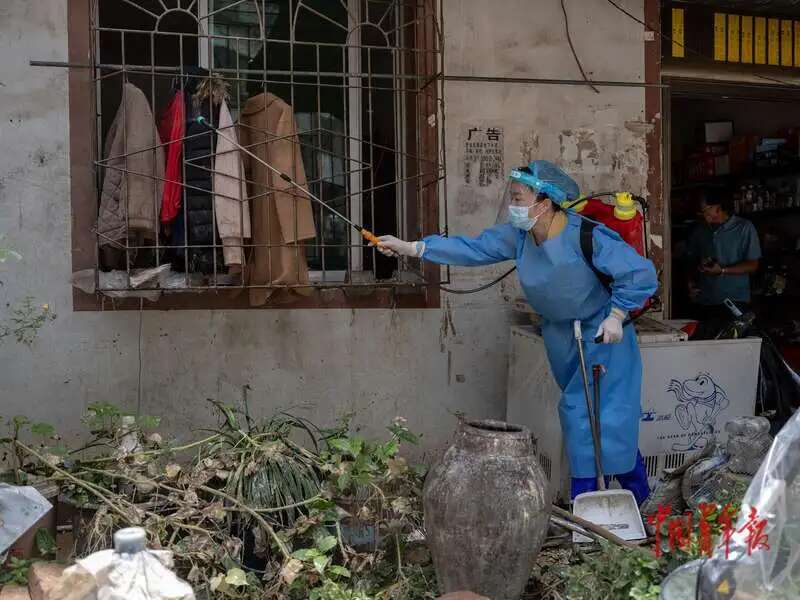 洪水退去,当地居民吴女士早早起床整理房屋,为城市早日恢复生机努力