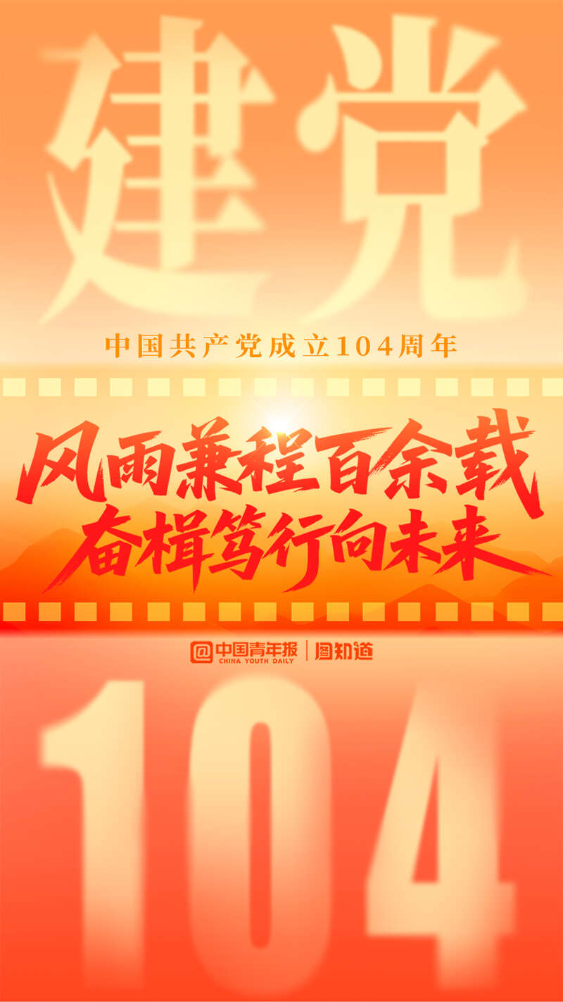中国共产党成立104周年,百余年初心未改,使命在肩。风华正茂的大党正以坚定历史自信、保持历史主动和坚持团结奋斗之姿,在新时代新征程上勇毅前行,续写时代华章!