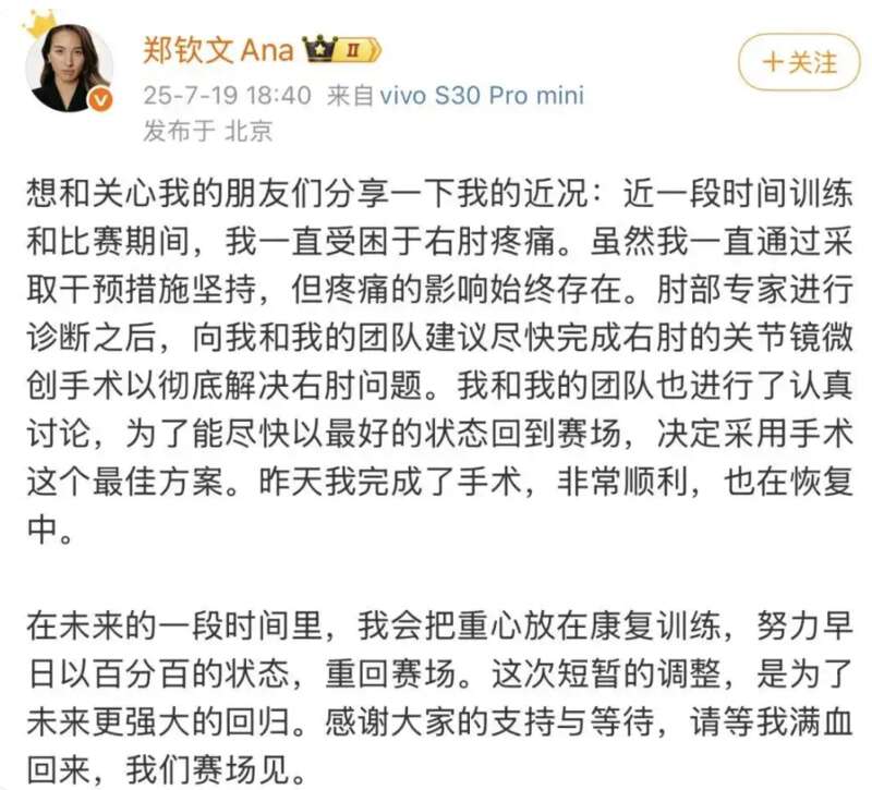 北京时间7月19日,中国网球运动员郑钦文在社交媒体发文《按下暂停键,为了更好地归来》,她透露自己昨天刚刚完成右肘手术,手术非常顺利。目前郑钦文正在恢复中,并表示“请等我满血回来,我们赛场见!”