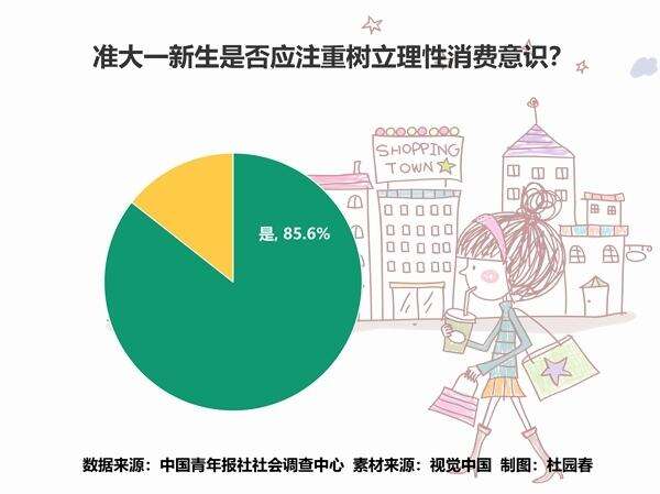 日前,中国青年报社社会调查中心联合问卷网(wenjuan.com),对1337名准大一新生进行的一项调查显示,电子产品(56.2%)、考驾照(46.6%)、出门旅游(39.7%)排在准大一新生暑期“消费清单”的前三。假期里,88.3%的受访准大一新生有冲动消费的经历。52.3%的受访准大一新生提醒需警惕因攀比心进行的消费。
