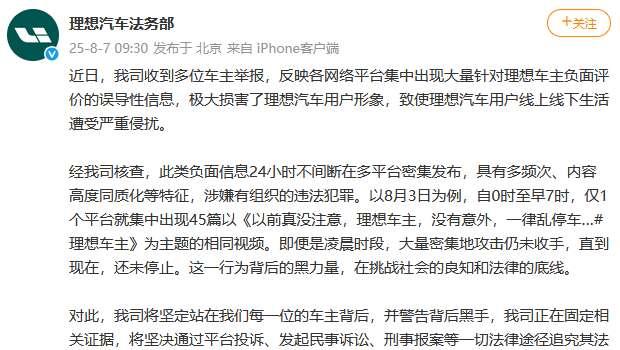 理想汽车回应车主遭大量负面评价:涉嫌有组织违法犯罪