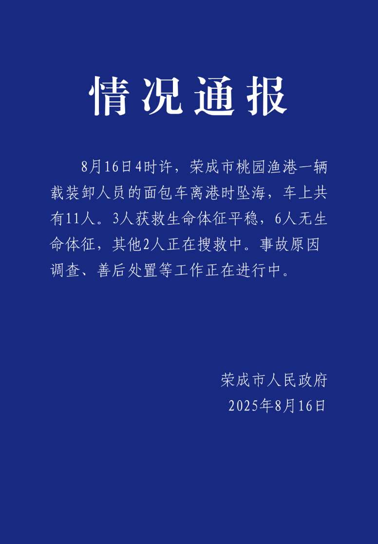 山东荣成市8月16日发布情况通报,8月16日4时许,荣成市桃园渔港一辆载装卸人员的面包车离港时坠海,车上共有11人。3人获救生命体征平稳,6人无生命体征,其他2人正在搜救中。