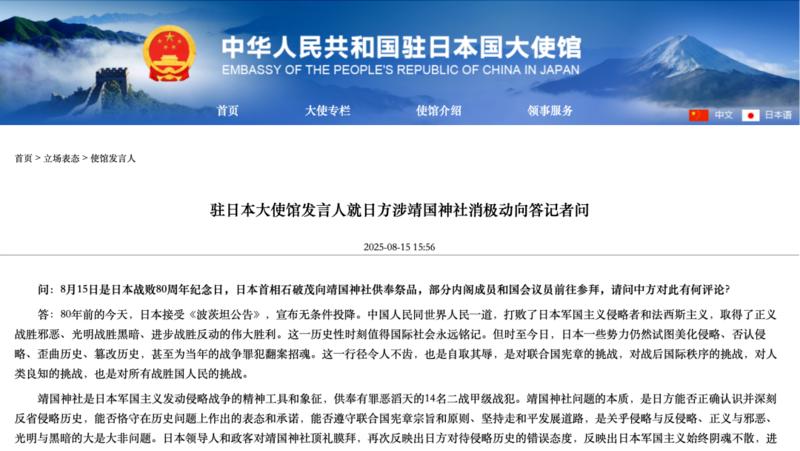 石破茂向靖国神社供奉祭品,我驻日使馆回应