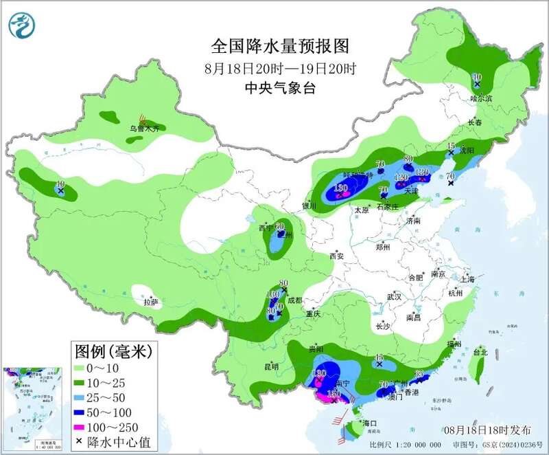 青海东部、甘肃中东部、陕西北部、内蒙古中部、黑龙江西部和东北部、辽宁中南部、山西北部、京津冀、四川盆地西部、贵州西部和南部、广西大部、广东大部等地部分地区有中到大雨,其中,内蒙古河套地区、陕西北部、山西北部、河北中北部、北京、天津、四川盆地西部、广西西部和南部、广东南部等地部分地区有暴雨或大暴雨。