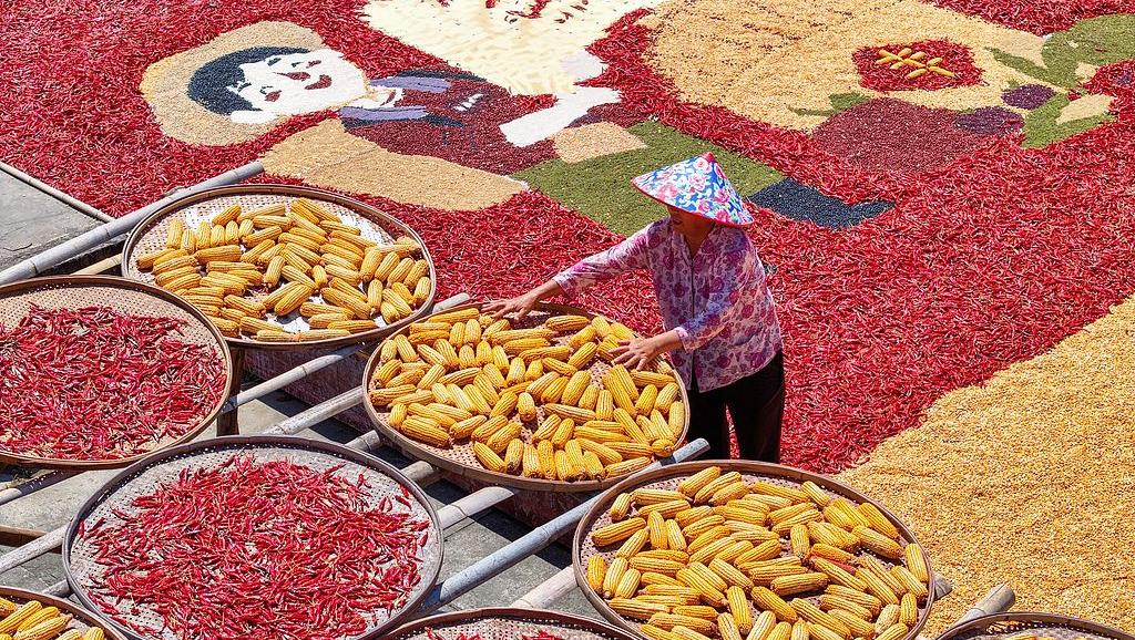 安徽黄山呈坎古村农作物“晒秋” 色彩缤纷丰收画洋溢喜悦氛围