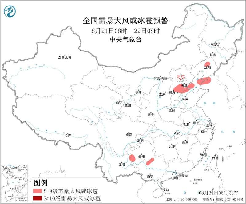据中央气象台网,预计8月21日08时至22日08时,华北大部、内蒙古东部、东北地区中南部、西南地区东部和南部、华南西部、江南东部等地的部分地区将有小时雨量大于20毫米的短时强降水天气,其中,河北中南部和东北部、北京北部山区和东南部、天津、辽宁中北部、吉林中东部、四川盆地东南部、贵州西南部、云南东北部、广西北部等地的部分地区小时雨量大于50毫米,最大可达80毫米以上;河北中南部、山东北部、辽宁中部和南部、贵州西南部、广西北部等地的部分地区将有8级以上雷暴大风或冰雹天气。