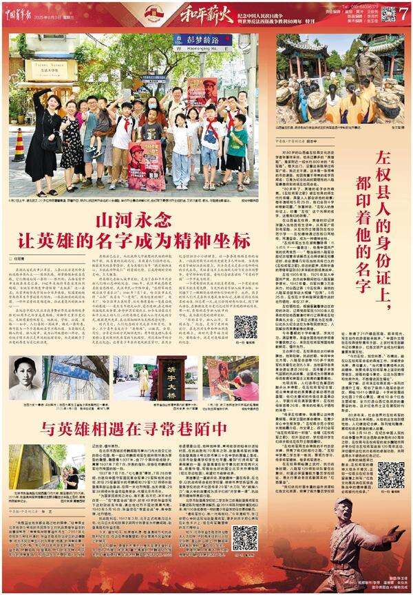 在纪念中国人民抗日战争暨世界反法西斯战争胜利80周年之际重走英雄路,用脚步丈量历史记忆,无疑有着特殊意义。地铁站、学校、公园、道路……如今,人们每到一座城市、踏足一条街巷,都可能与一个个英雄的名字不期而遇。当英雄之名铸入街道、融入城市,成为山河版图的一部分,这些地方便不再只是单纯的地理坐标,而是被赋予了历史的厚度与追忆的温度。
