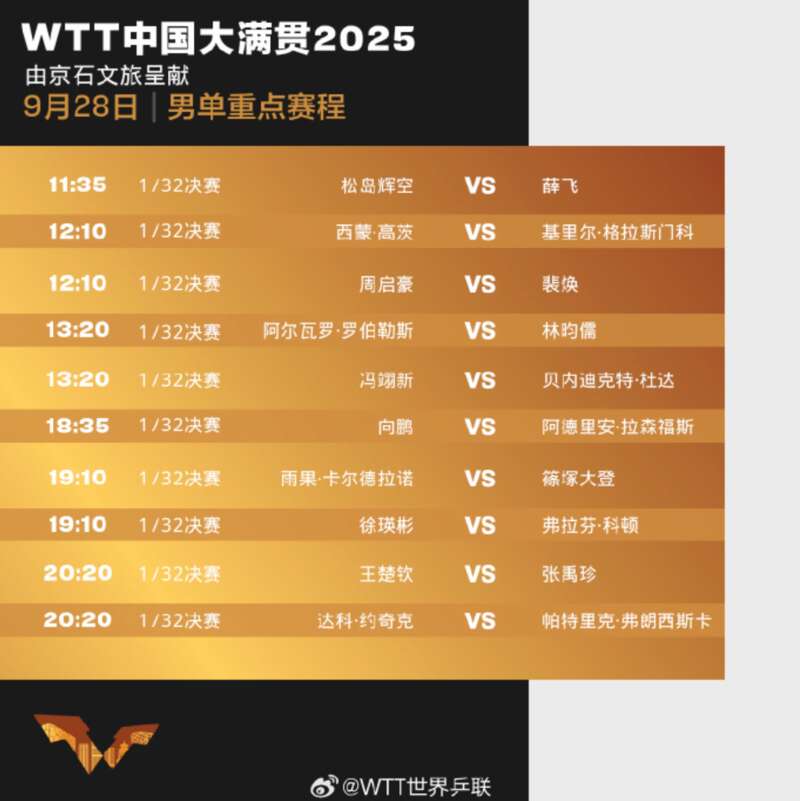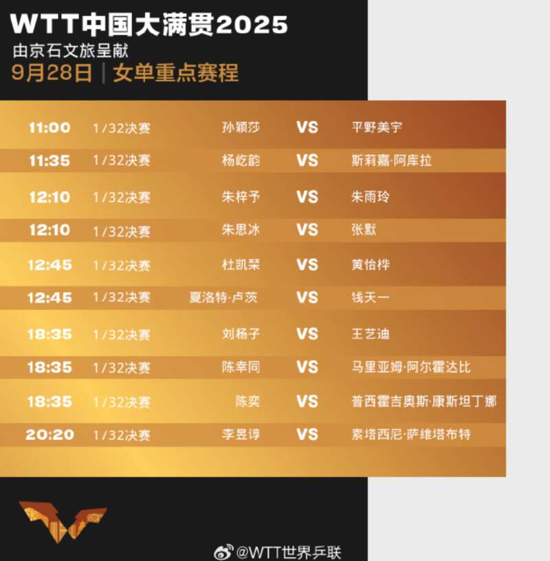 孙颖莎、王楚钦首轮遭遇硬仗!WTT中国大满贯正赛首日赛程
