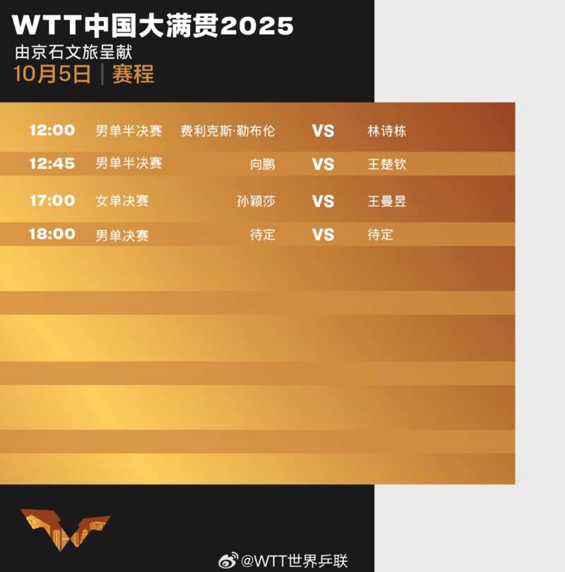 WTT中国大满贯2025最后一天精彩升级,10月5日将进行男单半决赛和决赛,女单决赛。孙颖莎、王曼昱、王楚钦、林诗栋、向鹏继续拼搏。男单国乒三人夺决赛名额,女单孙颖莎与王曼昱争冠。