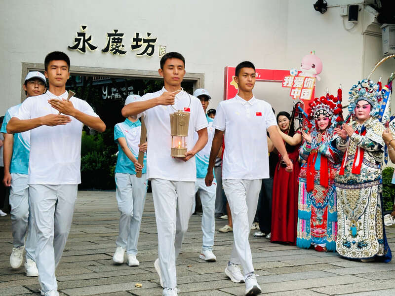 10月16日,十五运会和残特奥会圣火火种走进广州荔湾永庆坊,受到了市民游客的热烈欢迎。在粤剧演员的表演中,火种护卫队与火炬团队志愿者展示神圣的火种和火炬,体育精神和传统文化在这一刻具象化了。中青报·中青网记者 林洁/摄