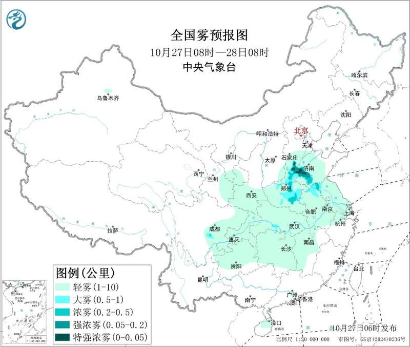 27日早晨至上午,河北南部、河南中北部、山东西南部、安徽北部、江苏西北部等地的部分地区有大雾天气,局地有能见度不足200米的强浓雾。此外,27日至29日,华北中南部大气扩散条件逐步转差,部分地区有轻度霾,局地中度霾天气。