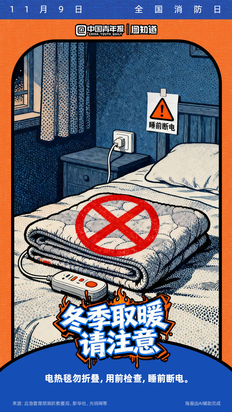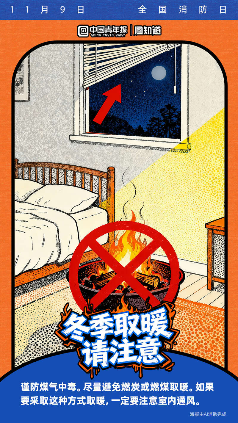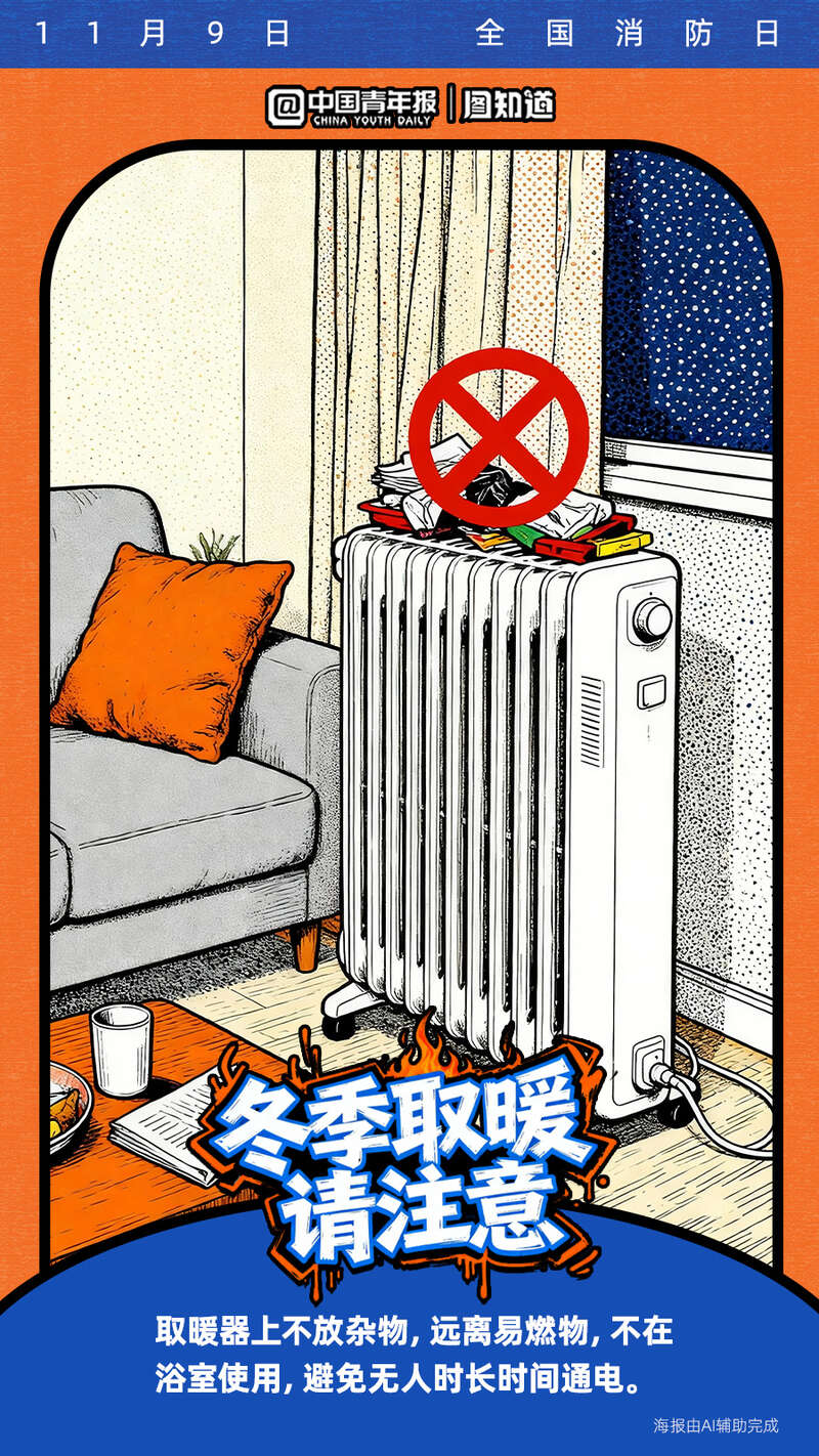 今天是11月9日全国消防日。寒冷的冬季已经到来,很多取暖器如果被不当使用将暗藏隐患!电热毯、取暖器等怎么用才安全?遇煤气泄漏该如何处理?收藏这份冬季取暖安全指南,速戳海报get消防安全知识点!