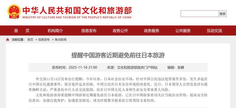 据文化和旅游部政府门户网站,外交部11月14日发布出行提醒:今年以来,日本社会治安不靖,针对中国公民违法犯罪案件多发,发生多起在日中国公民遇袭事件,部分案件迄未侦破,中国公民在日本安全环境持续恶化。近日,日本领导人公然发表涉台露骨挑衅言论,严重恶化中日人员交流氛围,给在日中国公民人身和生命安全带来重大风险。