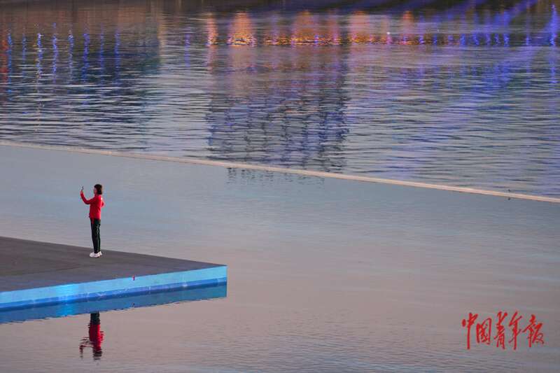 11月21日晚,广东深圳,深圳前海欢乐剧场,第十五届全国运动会闭幕式开始前,一名参加闭幕式的运动员在舞台前自拍留念。中青报·中青网记者 田嘉硕/摄