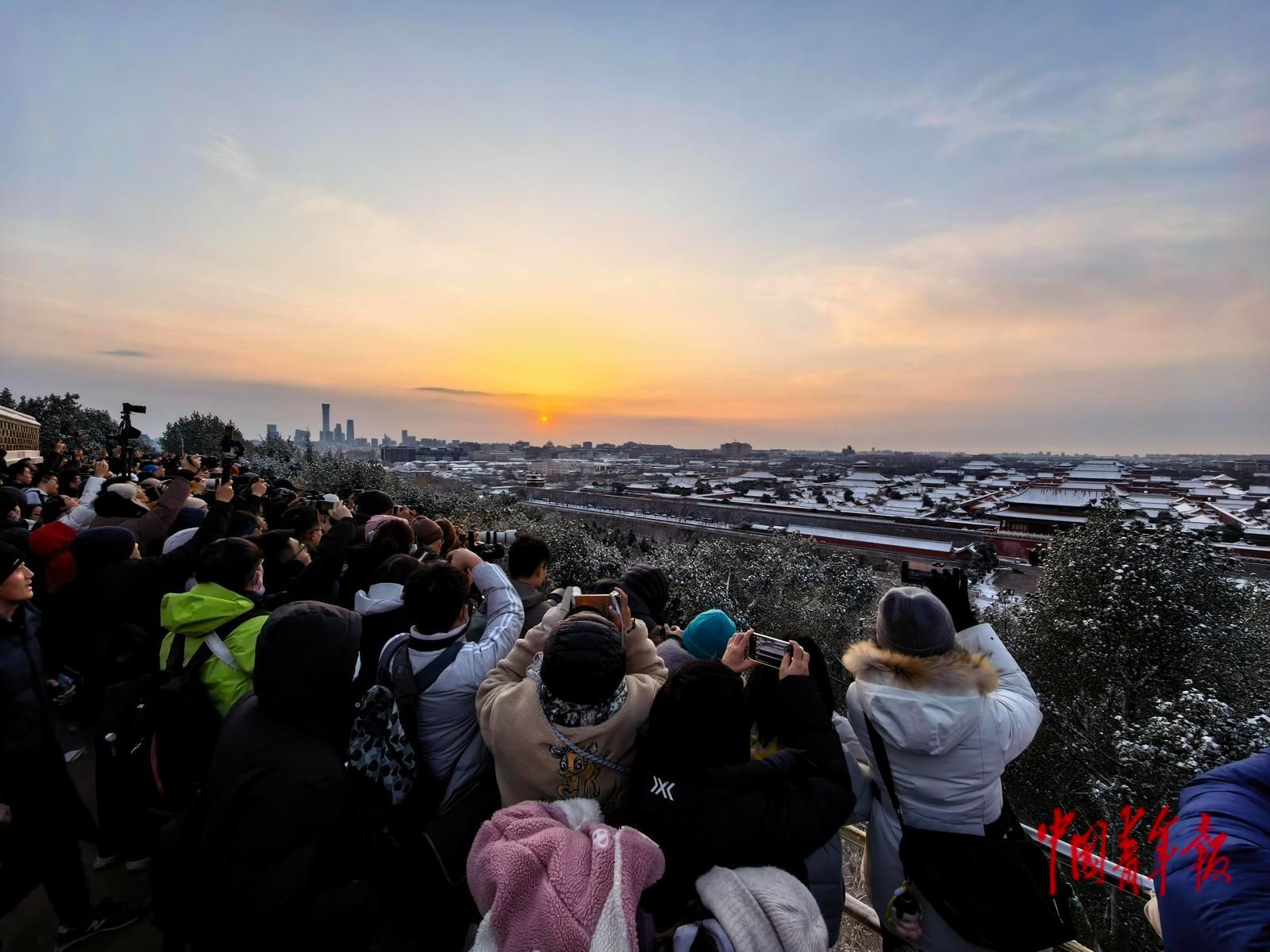 12月13日,清晨太阳缓缓升起,景山公园山顶上围满了游客,大家纷纷拿出手机和相机记录下初雪后的故宫。中青报·中青网记者 陈思阳/摄