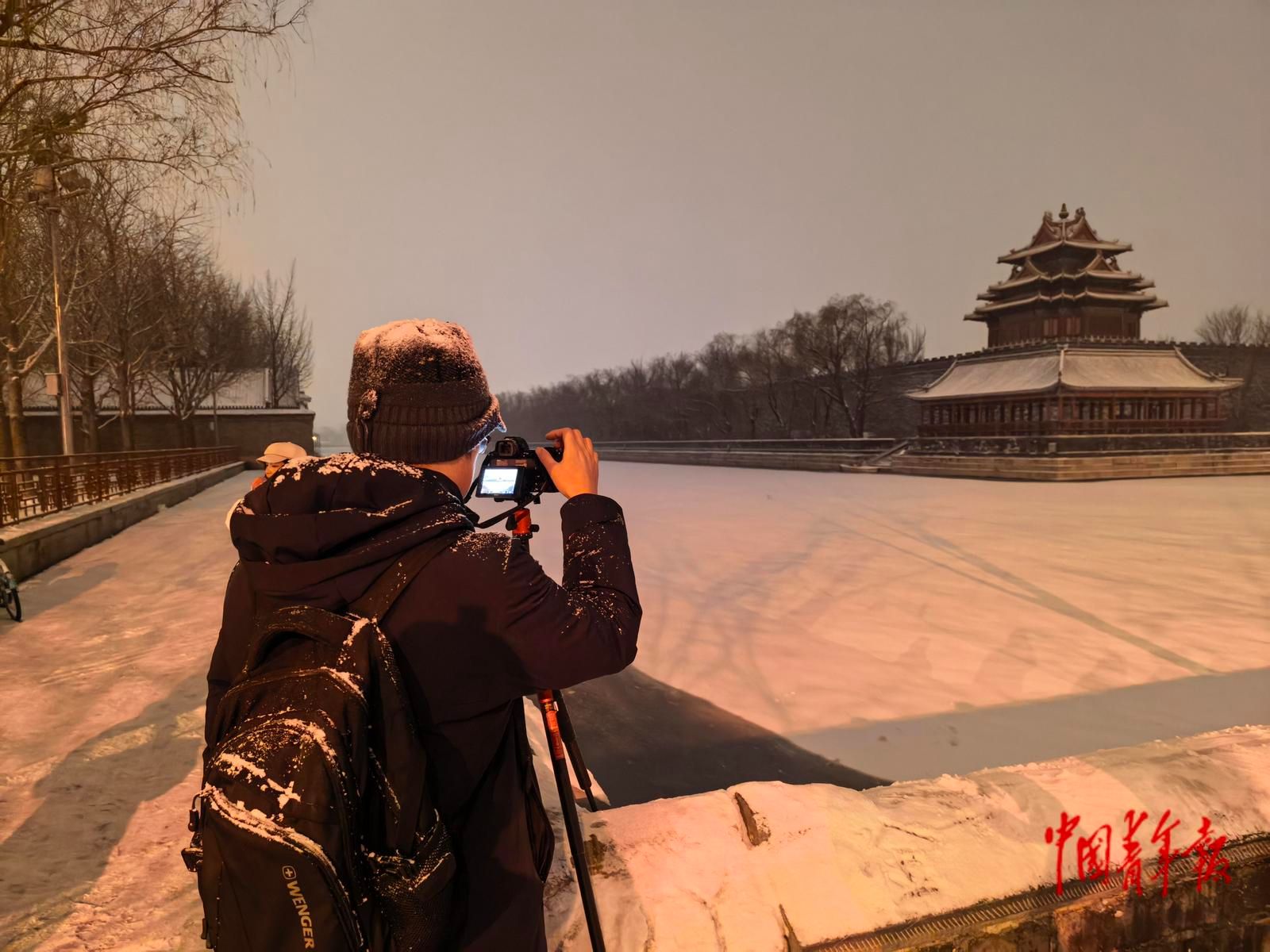 12月12日晚,北京故宫护城河边,一名摄影爱好者拍摄雪中的角楼。中青报·中青网记者 陈思阳/摄